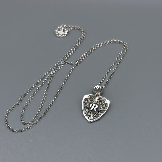 Crowned Heart & Personalized Monogram Filigree Shield Necklace in Silver