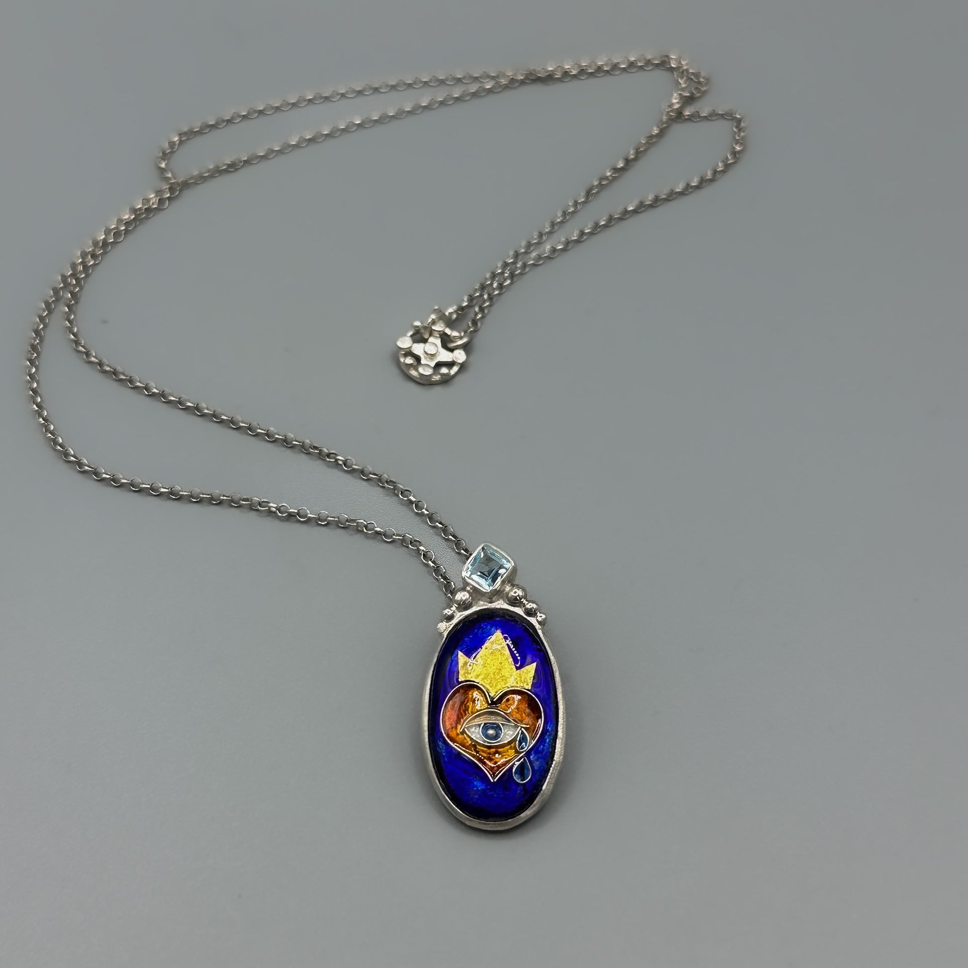 Handcrafted in sterling silver with luminous vitreous enamel on copper, the heart glows crowned in 24k gold. A pale sky blue topaz shines above like a guiding star, while blue enamel teardrops reminds us of the beauty that can be found in vulnerability.