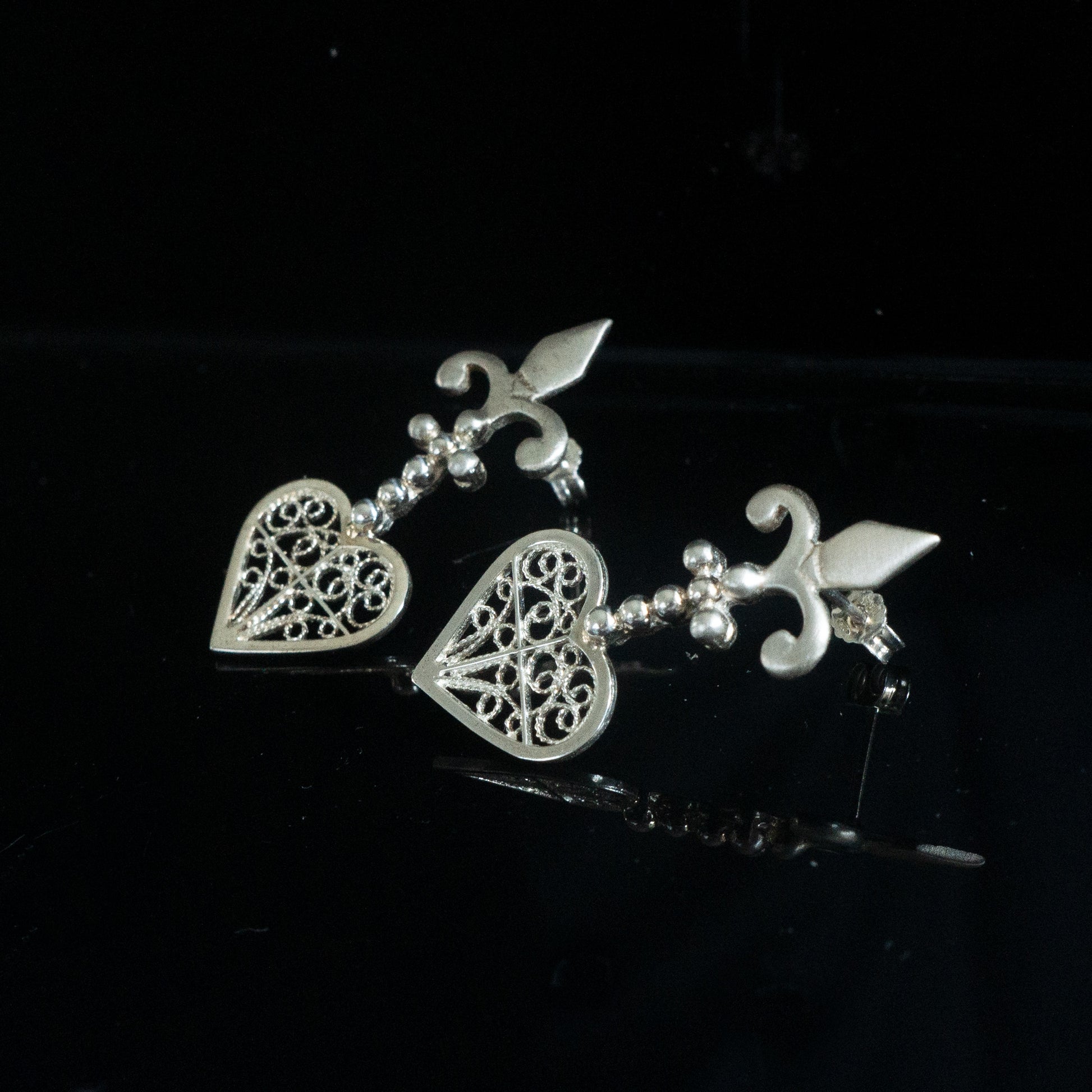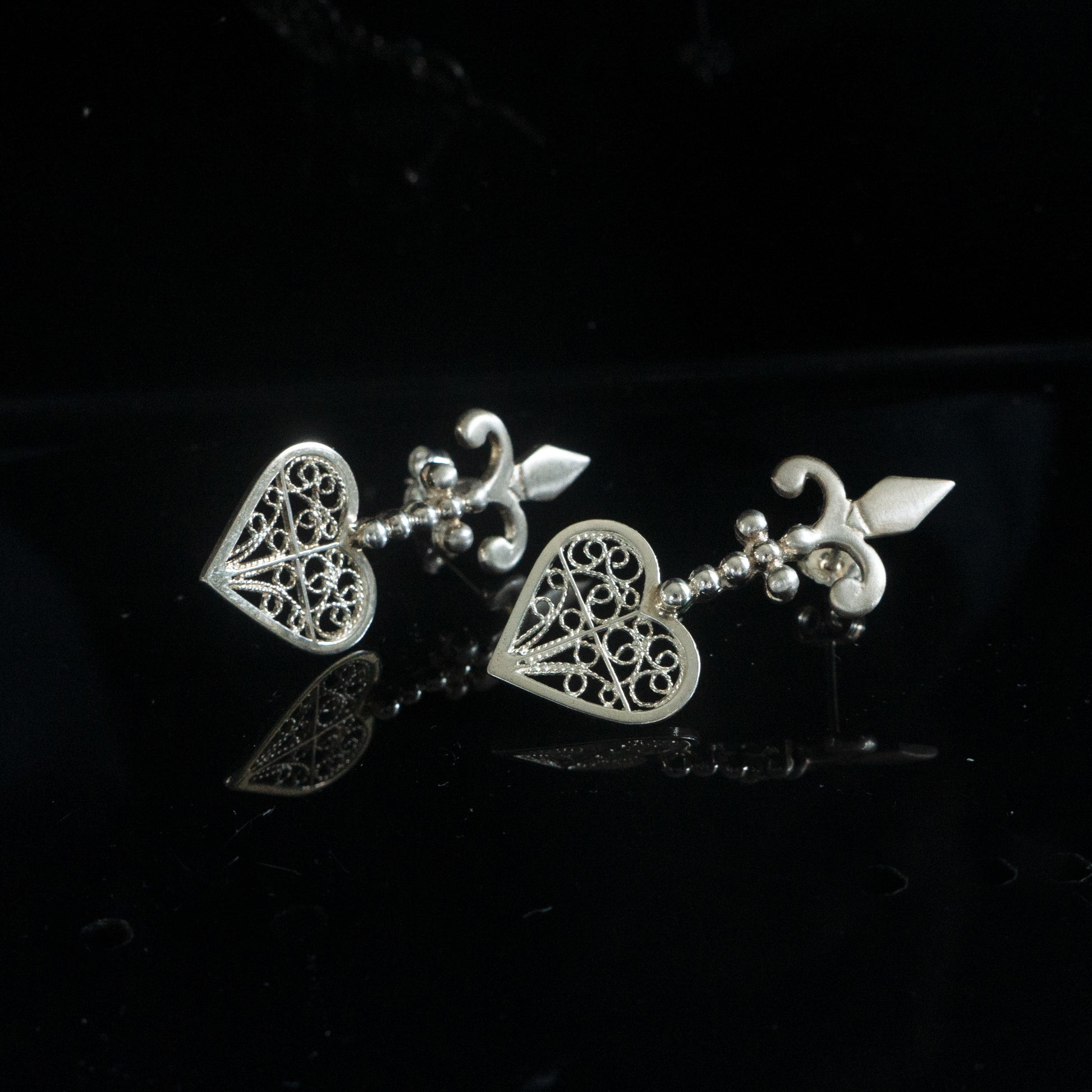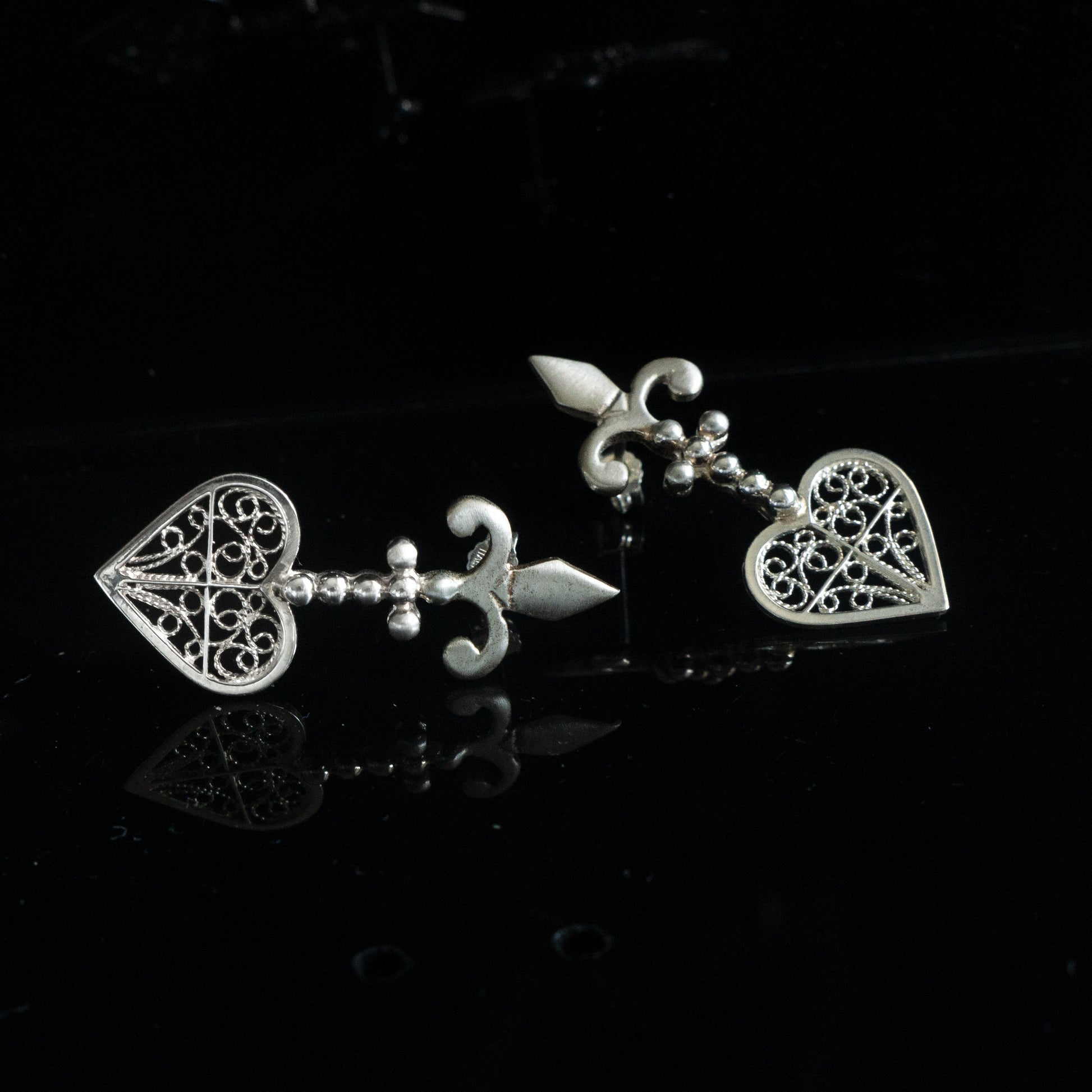 A fleur-de-lys stud anchors each piece at the lobe, leading to a granulated stem and a heart rendered in fine filigree — like an heirloom blade softened by time and care. It’s a sculptural design that speaks of strength, craftsmanship, and timeless style.